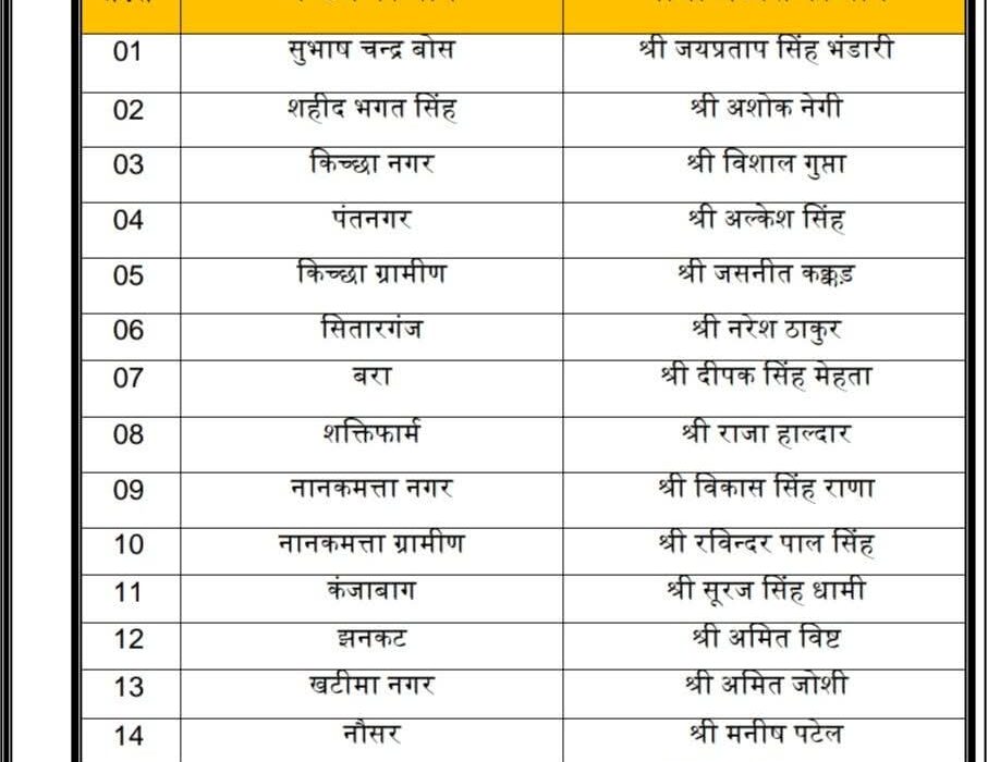रुद्रपुर।जिले के मंडल अध्यक्षों की सूची जारी कर दी गई है।सुभाष चंद्र बोस मंडल के अध्यक्ष जय प्रताप सिंह भंडारी बनाए गए। अशोक नेगी को शहीद भगत सिंह मंडल का, विशाल गुप्ता को किच्छा नगर मंडल का, अल्केश सिंह को पंतनगर मंडल, जसनीत कक्कड़ को किच्छा ग्रामीण, नरेश ठाकुर को सितारगंज, दीपक सिंह मेहता को बरा, राजा हाल्दार को शक्तिफार्म, विकास सिंह राणा को नानकमत्ता नगर, रविन्द्र पाल सिंह को नानकमत्ता ग्रामीण, सूरज सिंह धामी को कंजाबाग,अमित बिष्ट को झनकट, अमित जोशी को खटीमा, मनीष पटेल को नौसर और किशन सिंह ज्याला को चकरपुर मंडल का अध्यक्ष बनाया गया है।भारतीय जनता युवा मोर्चा ऊधम सिंह नगर के निम्न मंडल के मंडल अध्यक्षों की घोषणा इस प्रकार से की गई है।भाजपा नेता बिट्टू चौहान ने सभी नवनियुक्त मंडल अध्यक्षों को हार्दिक शुभकामनाएं दी।साथ ही कहा कि प्रदेश अध्यक्ष विपुल मेंदोली के मार्गदर्शन व जिलाध्यक्ष विपिन सिंह गहलोत के दिशा निर्देशन में नवनियुक्त मंडलाध्यक्ष संगठन को गति प्रदान करेंगे।
