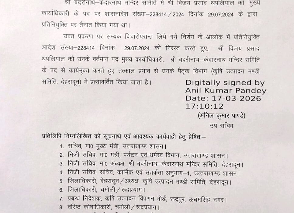 रुद्रपुर। विजय प्रसाद थपलियाल को उनके पैतृक विभाग कृषि उत्पादन मंडी समिति में भेज दिया गया।इस तरह का आदेश जारी किया गया है।थपलियाल को श्री बदरीनाथ_केदारनाथ मंदिर समिति में मुख्य कार्याधिकारी बनाया गया था।इसे निरस्त कर उनके पैतृक विभाग जाने का आदेश जारी किया गया है।