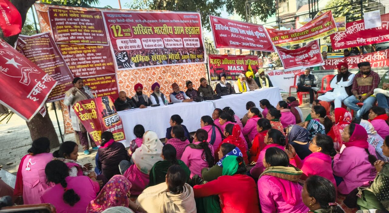 रुद्रपुर।श्रमिक संयुक्त मोर्चा, ऊधम सिंह नगर के बैनर तले श्रमिक, किसान, आशा, भोजनमाता सहित कई क्षेत्र के सैकड़ों कार्यकर्ताओं ने आज हड़ताल में उतरकर गांधी पार्क में सभा की और सरकार से 4 श्रम संहिताओं सहित अन्य काले कानूनों को रद करने की मांग की। वक्ताओं ने कहा कि 4 श्रम संहिताएं लाकर केन्द्र की मोदी सरकार मजदूर वर्ग को पूंजीपतियों का गुलाम बना देना चाहती है। इन 4 श्रम कोड्स के माध्यम से मालिक मजदूरों से कम वेतन पर ज्यादा घंटे काम लेगा। नए लेबर कोड्स में 8 घंटे काम के नियम को बदलकर 12 घंटे कर दिया गया है। नए श्रम कोड्स में उद्योगों में श्रमिकों के स्थाई होने के नियम को खत्म करके फिक्स्ड टर्म एम्प्लॉयमेंट का नियम लाया गया है। इन श्रम कोड्स में मजदूरों के यूनियन बनाने के अधिकार को खत्म कर दिया गया है।