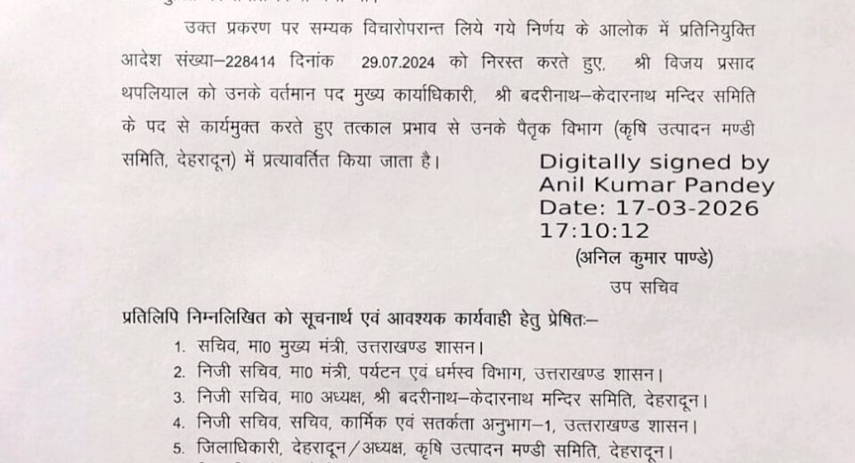 रुद्रपुर। विजय प्रसाद थपलियाल को उनके पैतृक विभाग कृषि उत्पादन मंडी समिति में भेज दिया गया।इस तरह का आदेश जारी किया गया है।थपलियाल को श्री बदरीनाथ_केदारनाथ मंदिर समिति में मुख्य कार्याधिकारी बनाया गया था।इसे निरस्त कर उनके पैतृक विभाग जाने का आदेश जारी किया गया है।