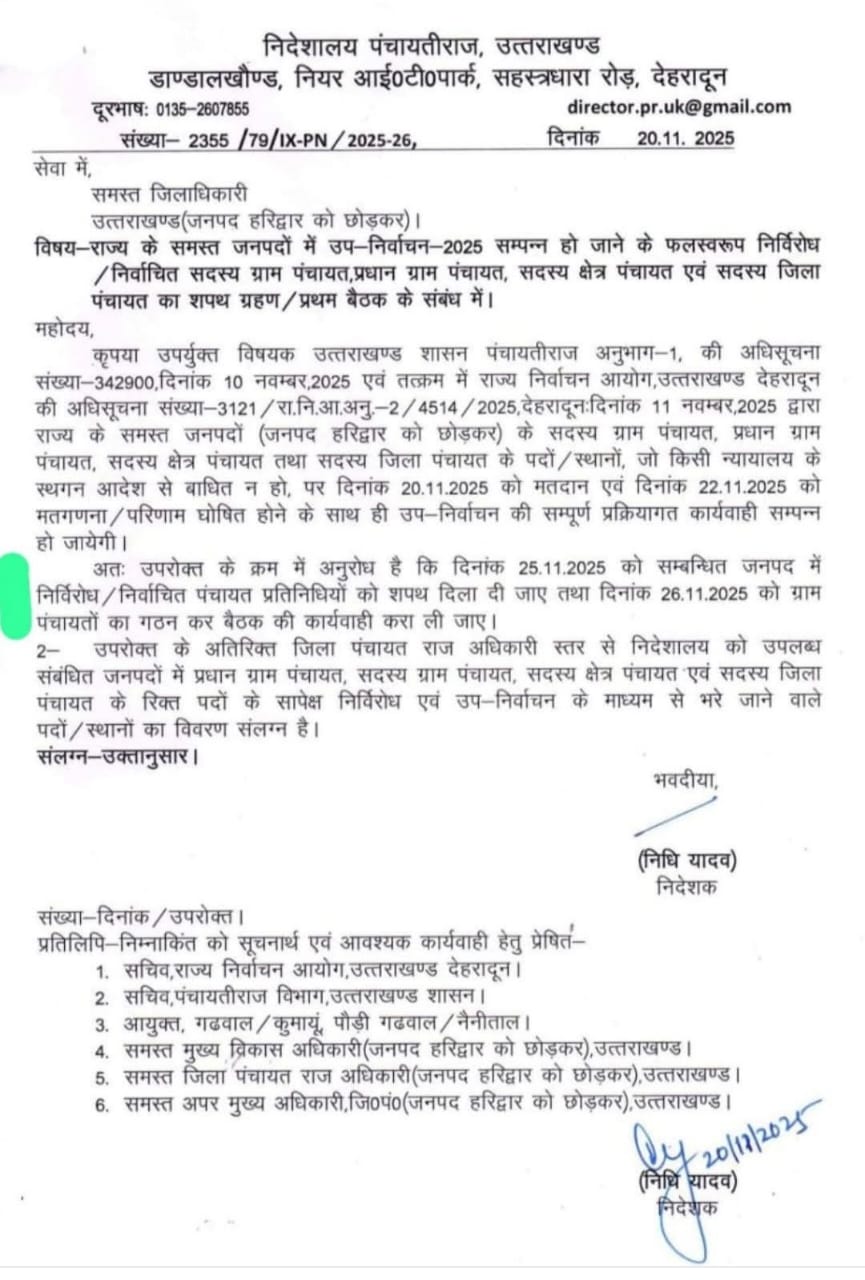 उत्तराखंड राजनीति निर्विरोध/निर्वाचित पंचायत प्रतिनिधि 25 को लेंगे शपथ BY locnirnay@gmail.com November 20, 2025 0 Comments