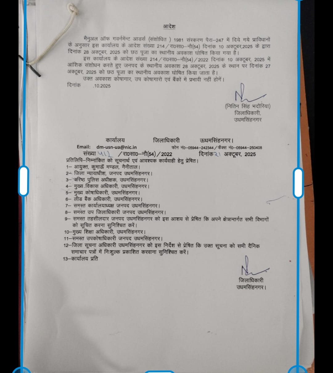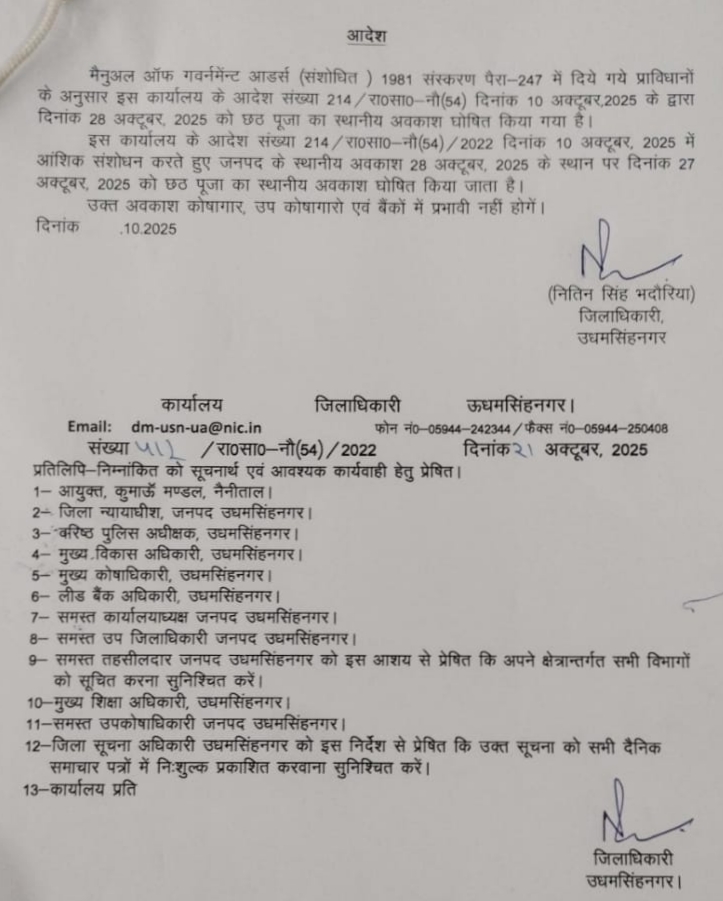 ऊधम सिंह नगर छठ पूजा पर घोषित अवकाश में संशोधन छठ पूजा पर पहले 28 अक्टूबर को अवकाश घोषित किया गया। इसमें आंशिक संशोधन करते हुए 27 अक्टूबर को अवकाश... BY locnirnay@gmail.com October 25, 2025 0 Comment