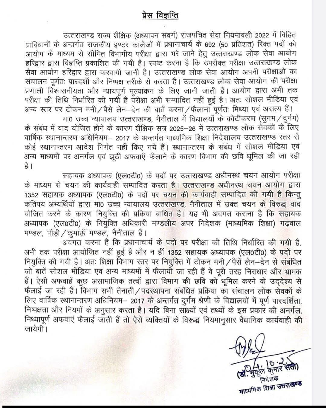 उत्तराखंड शिक्षा प्रधानाचार्यों की भर्ती को लेकर इंटरनेट मीडिया पर भ्रामक अफवाहें... रुद्रपुर: राजकीय इंटर कालेजों में प्रधानाचार्य के 692 (50 प्रतिशत) रिक्त पदों को आयोग के माध्यम से सीमित विभागीय परीक्षा... BY locnirnay@gmail.com October 5, 2025 0 Comment