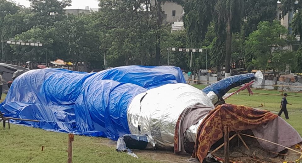रुद्रपुर के गांधी मैदान में रावण के साथ कुंभकर्ण और मेघनाद के पुतले बुधवार को खड़े कर दिए गए।गुरुवार दोपहर में तेज हवा के साथ बारिश हुई तो मेघनाद का पुतला लड़खड़ा कर गिर गया।जबकि रावण और कुंभकर्ण के पुतले को नीचे उतारकर त्रिपाल से धक दिया गया।जिससे बारिश से बचाया जा सके।